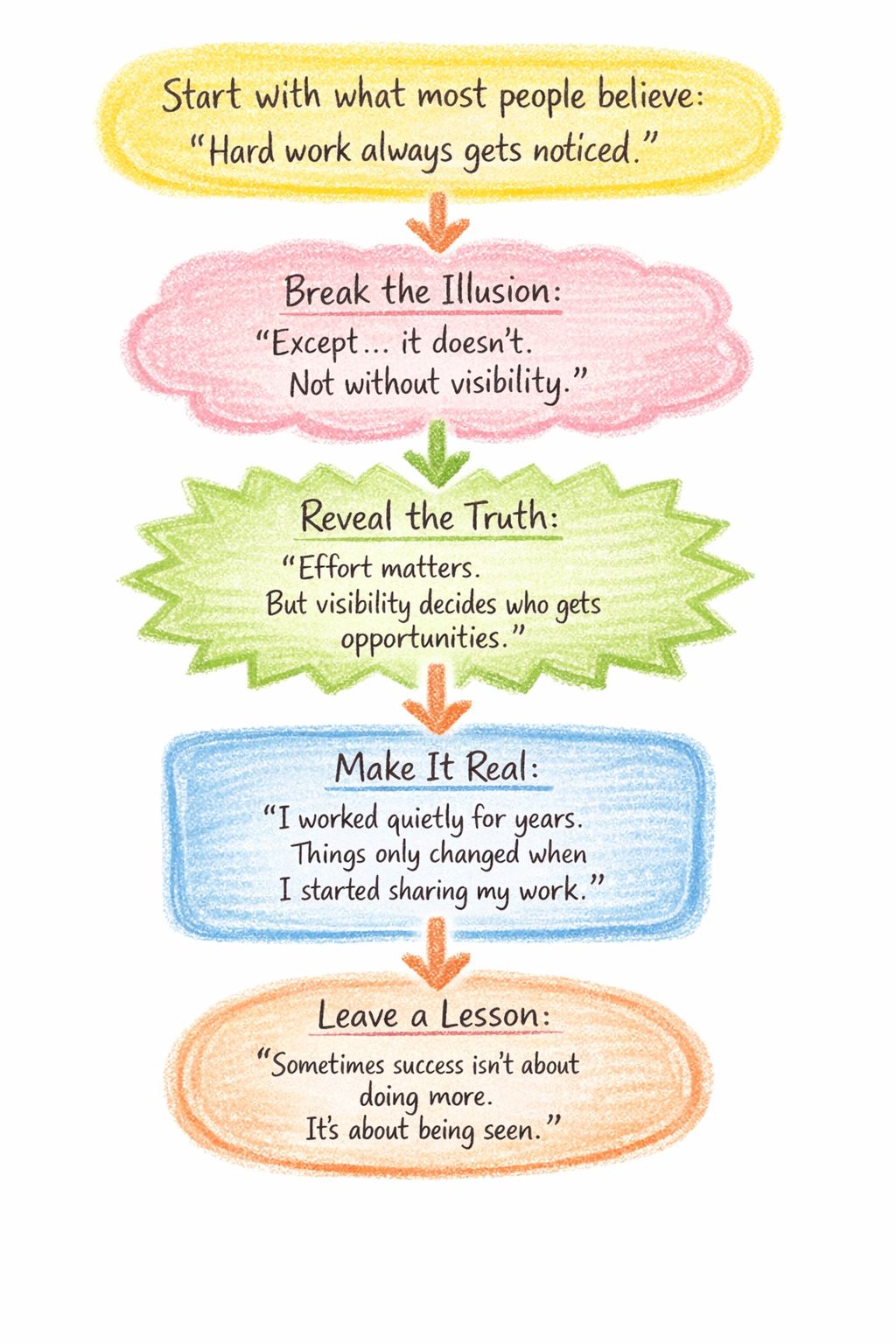 3. Reveal the Truth Share what people actually learn the hard way. "Effort matters. But visibility decides who gets opportunities."